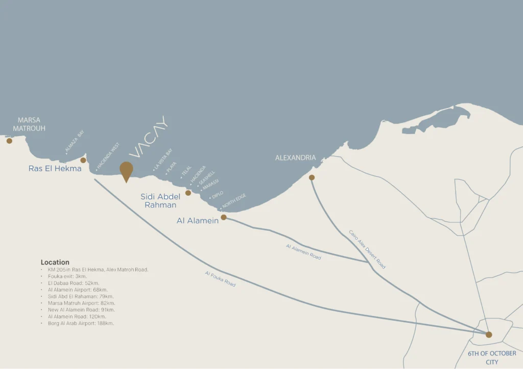 تقع قرية VACAY بالكيلو 205 في رأس الحكمة، والذي يُعد أحد أجمل الشواطئ في مصر التي تتميز بمياهها الفيروزية الصافية ورمال ناعمة مع شاطئ خالٍ من الصخور، ما يجعلها وجهة مثالية لمحبي الاستجمام والهدوء.